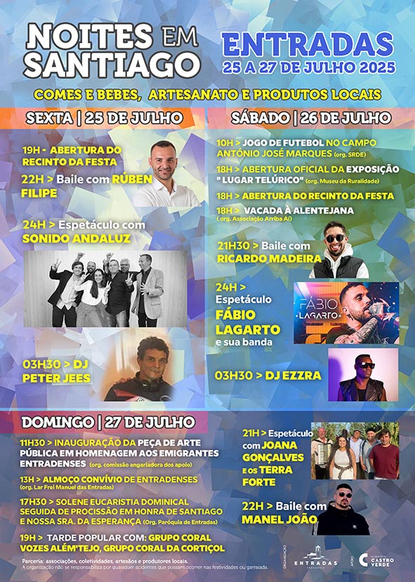 As Noites em Santiago estão de regresso à Vila de Entradas, entre 25 e 27 de julho. Muita animação popular, celebrações religiosas, feira de artesanato e produtos locais, comes e bebes, inauguração de peça de arte pública de Homenagem aos Emigrantes Entradenses, almoço convívio, entre outras iniciativas.